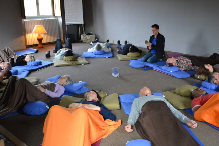 Différentes pratiques de méditation ont été proposées, pour expérimenter cette voie et la richesse qu’elle offre pour les dirigeants. Pour la plupart des participants, la mindfulness était une découverte. Ils ont expérimenté des pratiques assis sur un coussin, allongés (body scan, sur la photo), la marche méditative…